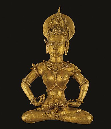 More on the image above: Tathagatas are not ‘original’ creator gods but they do emanate other beings like wrathful deities, teaching deities, bodhisattvas. The emanations are like advanced, energetic clones but each clone is an aspect of the Prime. Each is surrounded by four attendants, also enlightened but not as powerful. In four circles marking the intermediate points of the compass are four goddesses associated with offerings: Vajramala (southwest; garland), Vajragita (northwest; song), Vajranrtya (northeast; dance), and Vajralasya (southeast; amorous dance). Four further offering goddesses appear at the corners of the second, larger court: Vajrapuspa (southwest; flower), Vajradipa (northwest; lamp), Vajragandha (northeast; perfume), and Vajradhupa (southeast; incense). Each quadrant contains two hundred and fifty bodhisattvas who are associated with the Tathagata presiding over each of the four cardinal directions. The Vajralasya found in the Philippines was likely part of a very large set of beautifully crafted statues.