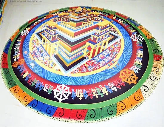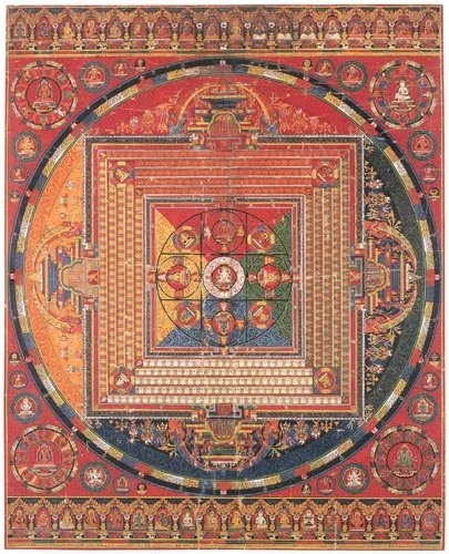 Above: Here is another mandala depicting a similar concept. This is the Kalachakra that helps describe our dimension of space-time within the greater ultimate reality outside of space-time, the complex relationships between deities, planets, stars and the subtle energies of our human bodies, aka astrology.