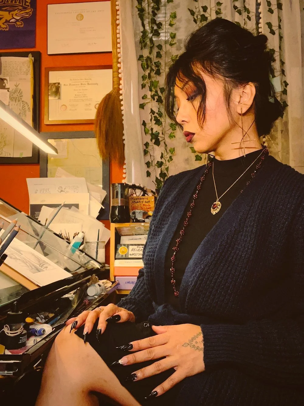 Trinidad is an artist who studies the transdisciplinary fields of art, poetry, sociology, systems theory, and folk anarcho-animism. She is a former college professor and creator of the courses Race & Comics and Gender & Comics at California College of the Arts. She helped develop the Genre Writing program at the low-residency M.F.A. program at Western Colorado University. She continues her work as a popular education and contemplative arts teacher in partnership with community organizations like the Queer Ancestors Project.
